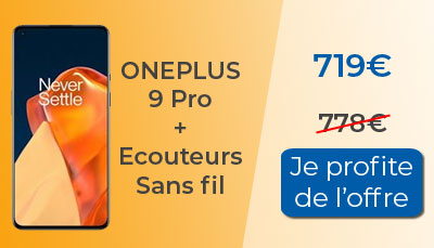 Disponible en France seulement à partir de 26 avril prochain, il est tout de même possible de précommander le OnePlus 9 pour être sûr de l'avoir dès sa sortie. Fnac vous propose un bon plan pour un OnePlus 9 pas cher. En vente normalement au prix de 778?, il est disponible actuellement avec 59? de remise immédiate ainsi qu'avec une paire d?écouteurs sans fil OnePlus Buds offerts. Vous pouvez donc acheter le OnePlus 9 (128 Go) au prix de 719?.
