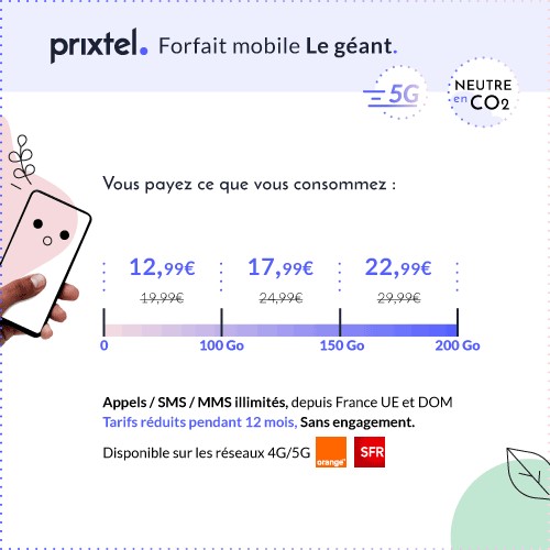A l'instar de toutes les nouvelles offres de son catalogue, le forfait Le géant de Prixtel est eco-friendly. L'opérateur s'engage en effet à compenser l'intégralité du CO2 émis par l'utilisation de votre forfait mobile en plantant des arbres en France.