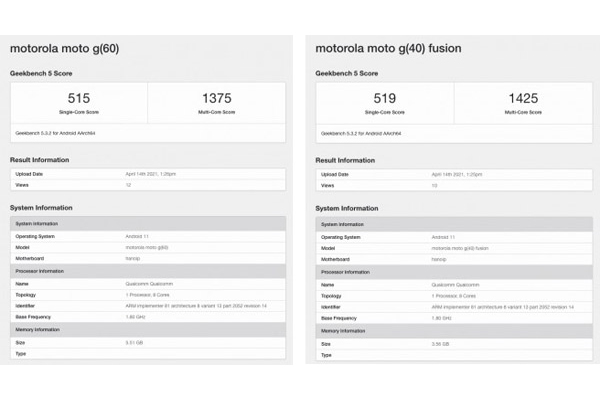 La capture d?écran de Geekbench concernant le Moto G60 indique que le mobile est équipé d'une puce Qualcomm Snapdragon 732G de milieu de gamme ce qui est aussi le cas pour le Moto G40 Fusion. Alors que le premier obtient un score de 515 en mono c'ur et 1375 en multic'ur, il embarque 6 Go de mémoire vive contre 4 Go de RAM pour le G40 Fusion qui atteint les scores respectifs de 519 et 1425. Tous les deux seront animés logiquement par le système Android 11 et avec une très légère surcouche logicielle Motorola.