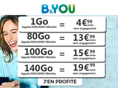 Avec les trois derniers forfaits B&You, vous pouvez accéder à B.tv à titre gratuit le premier mois d'abonnement puis payer la somme de 3? par mois, au lieu de 6?, pour continuer à bénéficier de cet avantage ! Ce service vous est offert avec le forfait B&You 1Go.