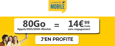 La Poste Mobile, de son côté, vous permet de bénéficier de son forfait SIM 80Go pour la somme de 14.99? par mois, même après la première année d'abonnement, si vous vous décidez avant le 26 juin inclus. Vous disposerez de 80Go d'Internet en France, dont 10Go utilisables lors de vos séjours en Europe et dans les DOM. Clients de la Box, vous bénéficiez d'un tarif avantageux : 10? par mois pendant 1 an, puis 13.99? chaque mois !