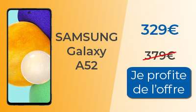 Grâce aux Soldes chez Amazon, le Samsung Galaxy A52 compatible 4G est disponible à 329€ au lieu de 379€. En l’achetant chez ce marchand, vous bénéficierez d’une remise immédiate de 50€ sur votre nouveau smartphone. Si vous faites partie du club Amazon Prime, le paiement en 4 fois sans frais est gratuit.