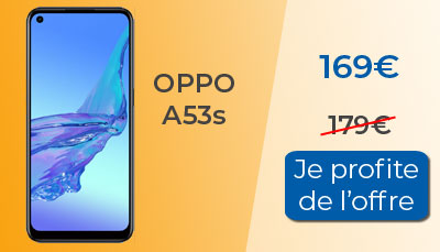 La troisième et dernière offre aujourd?hui pour changer de portable à moindre coût concerne l?Oppo A53s. Cette fois-ci, c'est chez Boulanger que vous le trouverez à petit prix. Lui aussi est disponible à moins de 170?. Son prix baisse de 179? à 169? car il bénéficie d'une réduction immédiate de -10?. Si vous avez envie d'en savoir plus sur les performances et les qualités de ce smartphone Oppo, n?hésitez pas à étudier attentivement notre test de l?Oppo A53s. Nous avons eu l'occasion de l'avoir entre les mains. Nous vous livrons tous ses secrets dans ce test.