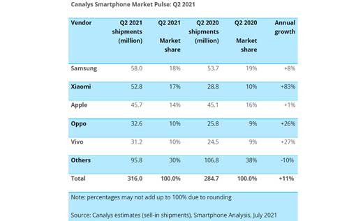Avec plus de 49 millions de smartphones commercialisés pour le compte du premier trimestre 2021, Xiaomi a enregistré une progression plus de 62 % sur un an. Mais la marque chinoise a encore fait mieux au cours des trois mois suivants. En effet, avec 52,8 millions d'appareils vendus, le chinois s'est offert une progression de plus de 80 % par rapport à l'année dernière sur la même période.