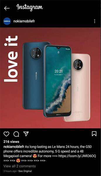 C'est effectivement sur le compte Instagram de Nokia Mobile France que plusieurs utilisateurs du réseau social ont pu voir une très courte vidéo du prochain Nokia G50 5G. La vidéo n'est plus disponible, car rapidement retirée, mais certains ont tout de même le temps de la télécharger. Elle met en scène trois mobiles de la marque montant doucement du bas de l?écran vers le milieu pour s'y arrêter. Elle présente ainsi le design du Nokia G50 5G avant même son annonce officielle attendue dans les prochaines semaines.