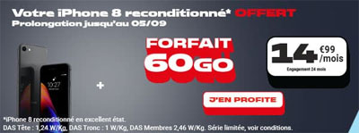 À l'occasion de la rentrée qui se profile, l'opérateur NRJ Mobile met en avant pour les adultes comme pour les jeunes une offre spéciale, valable jusqu'au 5 septembre prochain ! En effet, pour toute souscription au forfait 60Go - que nous vous détaillons dans un second temps - vous pouvez obtenir gratuitement l'iPhone 8, reconditionné en excellent état !