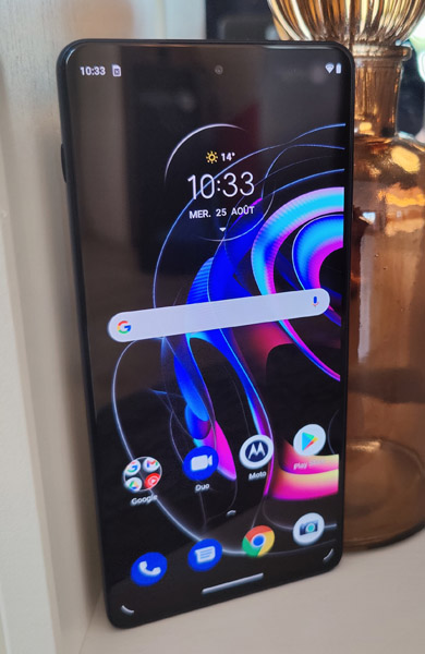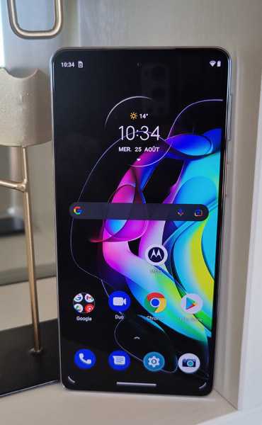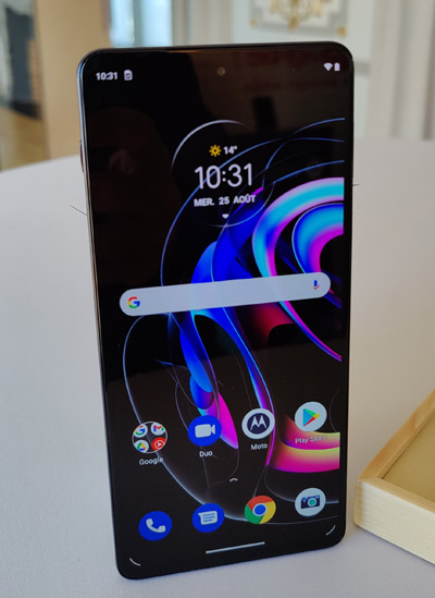 L?écran du edge20 Pro est identique à celui du edge20 tout comme sa connectivité, très complète. Il est certifié IP52 et propose un lecteur d'empreinte digitale sur le côté. Sa batterie a une capacité de 4500 mAh avec possibilité de charge à 30 watts, le bloc d'alimentation étant fourni. Le fabricant livre également un câble USB-C vers HDMI (avec prise de recharge USB-C) pour le relier à un moniteur, voire une télévision afin d'utiliser son système de report Ready For. Celui-ci permet d'avoir soit une interface type bureau d'ordinateur, les contenus TV, les jeux ou le Chat vidéo sur le moniteur ou la TV auquel il est branché. Notez que cette fonction est aussi disponible sur le Motorola edge20, mais le câble de liaison n'est pas livré avec ce qui n'est pas vraiment un problème étant donné que le système fonctionne aussi en Bluetooth.