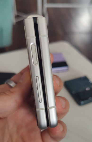 L?écran intérieur est recouvert par un film protecteur qui peut être enlevé et que l'on peut même changer si celui-ci s'avère trop rayé au cours de son utilisation. Toutefois, le constructeur nous dit avoir rendu son écran 80% plus résistant aux rayures que la version précédente. Toujours d'après Samsung, la charnière a été certifiée pour résister à au moins 200 000 manipulations ce qui correspond à 100 pliages par jour pendant 5 ans. Fermé, les bords sont très légèrement plus rapprochés l'un de l'autre que sur le Galaxy Z Flip 5G.