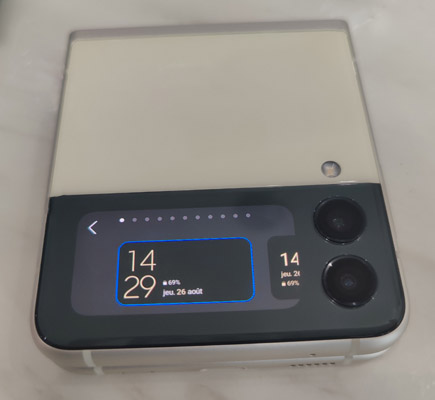 Lorsque le Galaxy Z Flip 3 est fermé, il y a un petit écran de 1,9 pouce (contre 1,1 pouce pour le Galaxy Z Flip 5G) en diagonale qui est maintenant tactile. Par défaut, il affiche l?heure. Pour l'activer, il faut taper rapidement deux fois dessus avec un doigt.