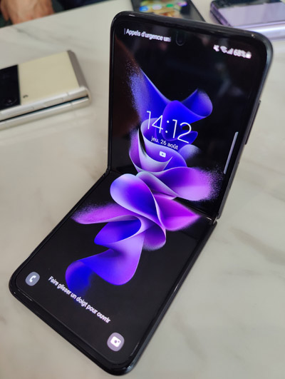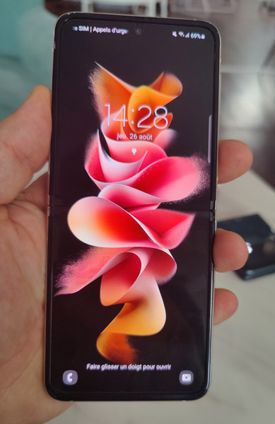 Une fois totalement ouvert, le Galaxy Z Flip 3 est finalement aussi grand qu'un Galaxy A72 de la marque par exemple comme le montre notre photo. La dalle OLED étant flexible, lorsqu'elle est entièrement déployée, on note toujours la présence d'une petite marque au milieu. Si on la remarque au début, on l'oublie assez rapidement au fil de l'utilisation de l'appareil.