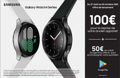Vous pourrez ainsi bénéficier, en plus du montant de reprise de votre ancien appareil, d'un bonus de 50 ? sous la forme d'un remboursement. De plus, Samsung vous offre également, dans le cadre de cette offre de lancement, 50 ? de crédit Google Play pour faire le plein d'applis sur vos Galaxy Watch 4 Series.