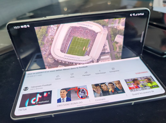 Grâce au mode pliant de l'appareil, on peut le placer sur une table ou un bureau avec une ouverture proche des 90 degrés et afficher, sur la partie supérieure de l?écran une vidéo ou une conférence en visio, et sur la zone inférieure, une autre application pour prendre des notes, par exemple.