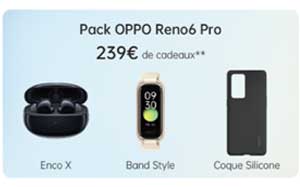 Pour ceux qui désirent s'offrir un Reno6 Pro 5G, ce sont des cadeaux encore plus intéressants qui sont offerts. En effet, OPPO offre gratuitement des écouteurs TWS OPPO Enco X, un bracelet connecté OPPO Band Styleet une coque en silicone. Valeur estimative de ces cadeaux en nature : 239 ?.