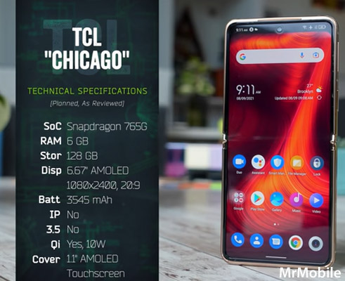 Techniquement, le téléphone portable pliant TCL Chicago était animé par une puce Qualcomm Snapdragon 765G avec 6 Go de mémoire vive et 128 Go d'espace de stockage. Il était équipé d'un écran extérieur de 1,1 pouce AMOLED et d'un écran principal de 6,67 pouces AMOLED 1080x2400 pixels se dépliant donc à la manière du Galaxy Z Flip3 de Samsung et du Motorola Razr. Compatible 5G et Wi-Fi 6, il est aussi Bluetooth et NFC, le tout géré par Android 11. Sa batterie avait une capacité de 3545 mAh avec le support d'une charge sans fil.