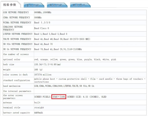 Le document du TENAA mentionne la présence d'un écran AMOLED d'une diagonale de 6,55 pouces ce qui est assez classique. Ce qui l'est beaucoup moins, c'est sa définition : 3840x2160 pixels soit autant que sur le Sony Xperia 1 III, le seul à ce jour à proposer une telle définition et donc une telle densité de pixels. L?écran du Xiaomi pourrait donc dépasser celui du Sony de 0,05 pouce. Toutefois, il faut aussi remarquer que l?écran du Xperia 1 III est au format 21:9, une spécificité des téléphones portables du japonais et une originalité que ne devrait pas embrasser Xiaomi, préférant proposer des écrans plus classiques pour convenir à un public aussi large que possible.