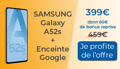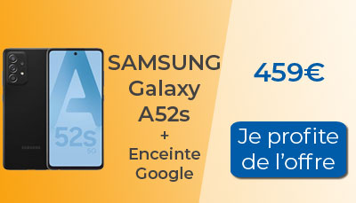 Pour fêter dignement le lancement du Galaxy A52s 5G, Samsung a vu les choses en grand. Pour tout achat d'un Galaxy A52s avant le 15 octobre, le constructeur vous offre une enceinte Google Nest Audio d'une valeur de 100?. Pour en profiter, il suffit de réaliser votre achat entre le 1er septembre et le 15 octobre inclus. On vous conseille de vous rendre sur le site de Boulanger pour profiter de cette offre incroyable. Vous y trouverez un bulletin de participation et le lien pour remplir votre demande directement en ligne. Quelques minutes vous suffiront pour faire la demande de votre cadeau. Vous recevrez gratuitement votre enceinte Google sous 4 à 6 semaines.