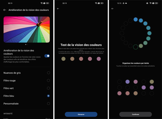 Il y a de nouvelles icônes et des animations améliorées. L'organisation des paramètres est légèrement différente, mieux gérée et plus efficace. La forme des icônes par défaut du tiroir des notifications est désormais ronde. En outre, on peut désormais compter sur la possibilité d'ajuster les couleurs de l'interface selon celles présentes sur l'image de fond d?écran du smartphone depuis le menu Couleurs dans les paramètres de Personnalisations. Au sujet des couleurs, ColorOS 12 permet de gérer l'affichage selon votre propre vision. Le menu Amélioration de la vision des couleurs disponible dans la rubrique Accessibilité permet d'ajuster les couleurs en fonction de votre vue pour avoir les effets les plus confortables possibles. Il suffit de choisir le type de filtre à utiliser. Sinon, on peut aller dans le menu Personnalisée pour tester sa vision des couleurs où il s'agit d'organiser les couleurs par teinte.