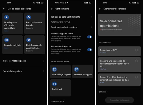 Comme évoqué plus haut, les paramètres ont été très légèrement retravaillés. Ainsi, on peut observer la nouvelle mise en page des réglages concernant les paramètres de sécurité et de mot de passe à travers la présence d'un tableau de bord qui permet de savoir si certaines fonctions sont activées ou pas (mot de passe de verrouillage, reconnaissance faciale, empreinte digitale et mot de passe de confidentialité). Le menu Batterie profite désormais de quelques conseils sur son optimisation. Ainsi, plusieurs actions peuvent être recommandées pour obtenir le meilleur de l'autonomie. Un tableau de bord est également disponible pour les données privées dans le menu Confidentialités. Toujours à propos de confidentialité et de données privées, le mobile indique par une petite notification lorsque la caméra frontale ou l'un des microphones du smartphone est utilisé. Cela permet à l'utilisateur de savoir quelle application se sert de l'un de ces composants pour éventuellement interdire l'accès si c'est trop sensible.