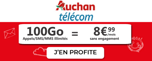 De son côté, Auchan Telecom met à disposition son forfait avec 100Go d'internet en France pour la somme de 8,99? par mois au lieu de 19,99?, et ce, les 12 premiers mois d'abonnement !