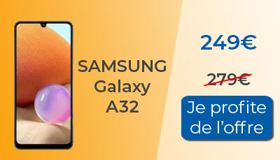Si vous êtes à la recherche d'un nouveau smartphone Samsung mais que vous ne souhaitez pas y consacrer un très gros budget, nous vous conseillons le Samsung Galaxy A32. Si en plus vous n'avez pas de forfait mobile 5G, cette version 4G sera parfaite pour vous. Il est en promotion actuellement chez Boulanger. Grâce à une remise immédiate de -30?, son prix chute de 279? à 249? seulement ! C'est le bon moment pour s'offrir la qualité Samsung à moindre coût.