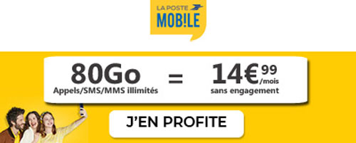 Avec La Poste Mobile, son forfait SIM 80Go est aussi au prix de 14,99? par mois sauf si vous êtes client Box ! Dans ce cas, vous pourrez payer votre forfait la somme de 10,99? par mois pendant 1 an puis verser 13,99? chaque mois. Vous pouvez ainsi réaliser une économie de 48? la première année ! Pour en profiter, il vous faudra souscrire avant le 13 novembre, minuit. Ce forfait vous permettra de disposer de 80Go en France, de 10Go en Europe - DOM inclus - ainsi que de l'illimité pour communiquer sans compter depuis l'ensemble de ces destinations.