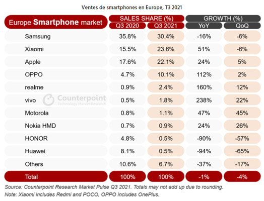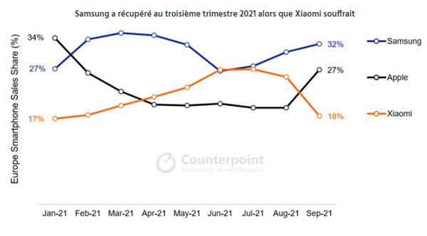 Les marques qui s'en sortent le mieux au cours du troisième trimestre 2021 sont Xiaomi, Apple et Oppo. Ces trois sociétés ont réussi à gagner des parts de marché significatives durant la dernière année. Xiaomi a continué à bien se développer sur la plupart des marchés européens alors que Oppo a surtout progressé en Europe occidentale. De son côté, Apple a dopé ses ventes grâce à la commercialisation de l'iPhone 13 en fin de trimestre. Samsung a réussi à se maintenir après avoir été impacté par les problèmes d'approvisionnement un peu plus tôt dans l'année. Une baisse est toutefois constatée et cela aurait pu être plus important si le Galaxy Z Flip3 n'avait pas séduit autant en Europe.