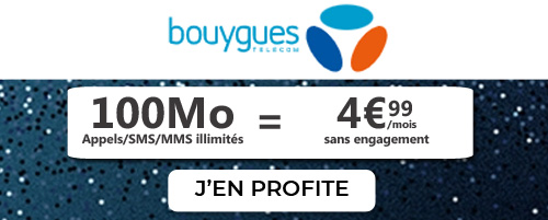 La série limitée B&You 100Mo sera idéale pour celles et ceux à la recherche d'un forfait sans engagement avec l'essentiel à prix mini ! Pour la somme de 4,99? par mois, en plus de l'illimité pour communiquer, vous pourrez apprécier gratuitement le service B.tv ! L'usage de ce dernier vous sera illimité avec le Wi-Fi ou bien décompté de votre enveloppe data de 100Mo. Attention, celle-ci est très vite utilisée et ne permet pas une lecture vidéo de plus de 15 minutes par mois. Les 100Mo proposés par votre forfait seront disponibles partout en Europe.