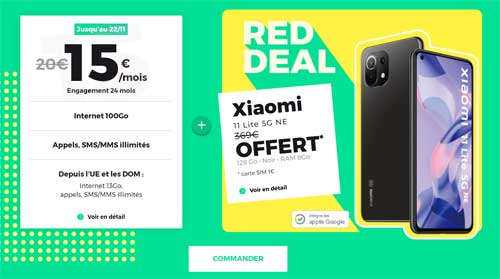 Disponible jusqu'au lundi 22 novembre inclus, le nouveau RED DEAL vous permet d'obtenir gratuitement le Xiaomi 11 Lite 5G NE pour toute souscription au forfait 100Go qui bénéficie d'une réduction valable sans condition de durée et que nous vous détaillons dans un second temps.