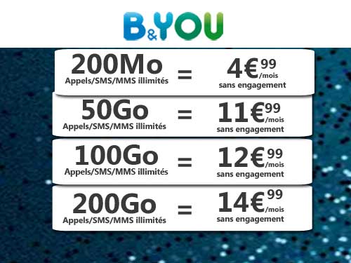 Pour le double de data, vous pouvez souscrire à la série spéciale B&You 100Go qui vous coûtera la somme de 12,99? par mois. Vous disposerez de 100Go d'internet en France, dont 15Go qui seront dédiés à votre connexion en Europe et dans les DOM.