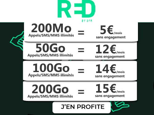 Le forfait RED à prix mini est l'offre RED 200Mo à 5? par mois. Vous pourrez utiliser cette enveloppe partout au sein de l'Union européenne. Attention toutefois à l'usage de cette dernière qui ne permet que 15 min de lecture vidéo et quelques consultations de sites internet dans le mois.