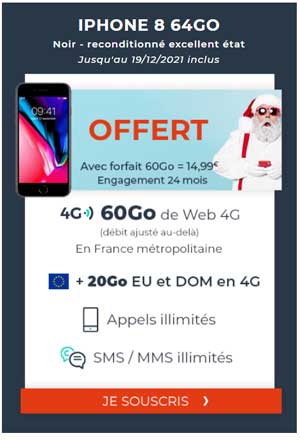 Vous souhaitez profiter d'un iPhone 8 reconditionné excellent état offert ? C'est possible à la condition de souscrire au forfait 60Go à 14,99? par mois ! Vous devrez également vous engager pour une durée minimale de 24 mois.