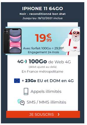 Enfin, de la même manière que précédemment cité, il est possible d'acquérir l'iPhone 11 - reconditionné bon état - pour la somme de 19,99? si vous souscrivez au forfait 100Go à 29,99? par mois pendant 2 ans, au minium.