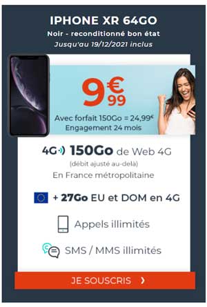 L'iPhone Xr, reconditionné bon état, est à seulement 9,99? si vous vous abonnez au forfait 150Go à 24,99? par mois ! Notez que cette offre promotionnelle vous engage pour une durée d'au moins 24 mois.