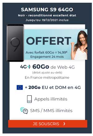 Si vous souhaitez obtenir gratuitement le Samsung S9, de coloris noir et reconditionné excellent état, il vous faudra souscrire au forfait 60Go à 14,99? par mois pendant au moins 2 ans !