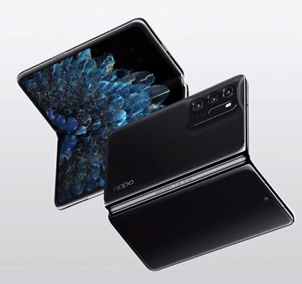 Le smartphone propose un bloc optique dans le dos. Il fait penser à celui installé à l'arrière du Find X3 Pro avec des bords du dos qui reviennent délicatement vers le sommet du bloc, mais il rappelle également celui du Reno6 avec des capteurs alignés dans le sens vertical. Il y a trois capteurs photo au dos. Le module principal est un Sony IMX766 de 50 mégapixels accompagné d'un objectif de 16 mégapixels, Sony IMX481 et un téléobjectif de 13 mégapixels. Il y a également un capteur sur l?écran interne et un dernier sur l?écran externe. Ce dernier peut aussi servir de capteur à selfie avec l'autre volet ouvert pour le cadrage. Le mobile est alimenté par une batterie de 4500 mAh supportant la charge 33 watts. Il peut également se charger sans fil (15 watts) ou proposer la charge inversée (10 watts). Il est décliné en noir, en blanc ou en violet. Il est alimenté par une puce Qualcomm Snapdragon 888 avec de la mémoire vive en LPDDR5 et de l'espace de stockage répondant à la norme UFS 3.1 pour des échanges rapides. Le lecteur d'empreinte digitale est installé sur la touche de mise en veille. Notez la présence de deux haut-parleurs pour un son stéréo compatible Dolby Atmos.