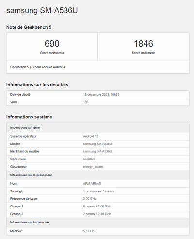 D'après la fiche publiée sur le site Geekbench, il apparait que le SM-A536U donc le Galaxy A53 5G est animé par Android 12 ce qui est loin d?être une surprise. Il embarque 6 Go de mémoire vive. Toutefois, il faut s'attendre, comme sur la plupart des modèles des constructeurs, à d'autres déclinaisons avec peut-être un modèle qui pourrait disposer de 8 Go de RAM. La capacité de stockage interne n'est pas mentionnée sur la fiche. Par contre, on peut y voir le processeur utilisé par l'appareil. Il s'agit d'une puce Samsung Exynos 1200 qui est composée de 8 c'urs, dont deux ayant une fréquence de 2,40 GHz, les autres plafonnant à 2 GHz. C'est tout ce que l'on apprend de la fiche publiée sur geekbench.com.