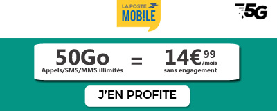 Jusqu'au 15 janvier 2022, La Poste Mobile vous offre gratuitement l'option 5G (5 ?/mois normalement) sur son forfait de 50 Go. Pour un peu moins de 15 ?/mois, vous pourrez donc profiter de la 5G sur votre nouveau smartphone via la couverture réseau de l'opérateur SFR.