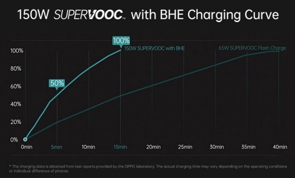 Chez Oppo, la technologie s'appelle SUPERVOOC 150W et le constructeur annonce également une performance de recharge à 50% en 5 minutes et une charge complète en 15 minutes sur une batterie de 4500 mAh. Cette technologie intègre la charge directe avec deux pompes capables de supporter un courant allant jusqu?à 20V/7.5A. On peut également compter sur le système Battery Health Engine qui est déjà disponible sur le nouveau Oppo Find X5 et le Oppo Find X5 Pro permettant de maintenir la batterie à 80% de sa capacité originale même après 1600 cycles de recharge. Selon Oppo: ?en améliorant la formule de l?électrolyte, les électrodes sont réparées en continu autant en charge qu'en décharge pour former une interface électrolyte solide (SEI) plus stable et durable capable de rester en parfait état en temps réel. En réduisant l'usure des électrodes positives et négatives, cette technologie booste les performances de la batterie et prolonge sa durée de vie.?