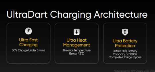 Pour en revenir à la technologie de charge elle-même, elle a été baptisée UltraDart Charging Architecture chez realme. Il s'agit d'une solution qui allie vitesse, sécurité et autonomie de la batterie. Le chargement utilise des pompes de charge multi-boost pour augmenter le courant de charge pour une opération des plus courtes possibles. Cette technologie permet de garder le téléphone à une température acceptable pendant l'opération, soit en dessous des 43°C, selon le fabricant. L'appareil peut donc être tout à fait utilisable lors de la charge. Realme annonce également pouvoir garder une capacité de 80% après plus de 1000 cycles de recharge complets.