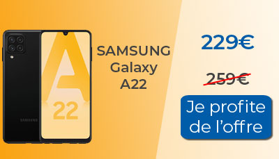 Si vous n?étiez pas intéressés par la promotion concernant le Samsung Galaxy S20 FE 5G, celle faisant baisser le prix du très abordable Samsung Galaxy A22 devrait vous satisfaire. Ce smartphone Samsung beaucoup plus abordable offre également une fiche technique très intéressante. L'enseigne Boulanger vous offre une remise immédiate de 30? qui le rend encore moins cher que d?habitude. Vous pouvez acheter le Galaxy A22 à 229? seulement au lieu de 259?. Un téléphone de cette qualité à un tarif aussi bas, ce serait dommage de passer à côté.