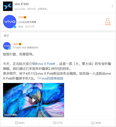 Vendredi dernier, le 25 mars, c'est sur le compte officiel de la marque Vivo que l'on pouvait voir la publication d'une image en une sorte de morphing entre les ailes d'un papillon et la charnière d'un smartphone pliant qui rentre en contact avec le coin d'un autre modèle identique. Un bref commentaire figure sur le message : « il y a toujours mieux et ça vaut le coup d'attendre ». Aujourd?hui, lundi, c'est une courte vidéo qui est mise en ligne sur le compte officiel de la marque Vivo. Celle-ci est accompagnée d'un message qui annonce la date de la présentation officielle du Vivo X Fold, le 11 avril. Il s'agira d'une annonce pour le marché chinois et nous les européens devront certainement attendre plusieurs mois avant de voir ce modèle arriver.