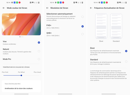 Les paramètres d'affichage proposés par défaut sont très bons et permettent de profiter d'un excellent écran. Il est toutefois possible de moduler certains effets et notamment de choisir parmi les modes de couleur différents dont Vif, naturel ou Pro avec la possibilité de jouer sur la température des couleurs. L'affichage peut également être ajusté automatiquement à l?éclairage ambiant en termes de température afin d'apporter un peu plus de confort visuel. On peut bloquer la définition de l?écran sur FHD+ (1080x2412 pixels) ou QHD (1440x3216) ou sélectionner le mode dynamique pour que ce soit le mobile qui ajuste la lisibilité. Idem pour la fréquence de rafraîchissement. La luminosité offerte par l?écran du OnePlus 10 Pro est suffisante pour s'en servir en extérieur, même en plein soleil.
