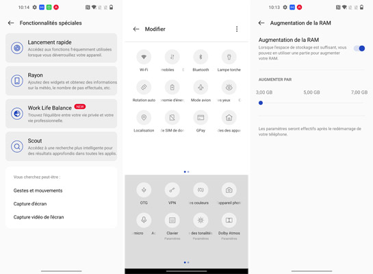 Si on balaie l?écran du haut vers le bas, sur la partie gauche de l?écran, on tire les dernières notifications alors que si le geste est réalisé sur la partie droite de l?écran, on a droit au menu « Shelf » proposant un module de recherche, les informations météo, quelques raccourcis vers certaines applications, le nombre de pas réalisés, etc. Ce module est personnalisable dans les paramètres avec la possibilité d'ajouter des widgets, par exemple. Le module Google Discover est disponible sur la partie gauche de l?écran d'accueil. On peut lancer rapidement certaines applications depuis le panneau d'identification avec le lecteur d'empreinte en faisant un geste vers l'une des icônes qui s'affichent autour du lecteur. Un module de bien-être numérique est également présent ainsi que des options de contrôle parental. Contrairement à ColorOS, il n'y a pas de barre latérale ni de fenêtres flottantes. Il est possible de gérer les notifications pour ne pas être constamment dérangé par certaines qui pourraient ne pas être importantes, via la fonction Work Life Balance. Notez la possibilité de personnaliser l?écran Always-on à partir d'une photo de la galerie qui sera alors reproduite sous la forme d'un croquis avec seulement quelques traits blancs sur un fond noir. Le gestionnaire multitâche permet d'accéder à toutes les applications ouvertes pour les fermes individuellement ou toute d'un seul geste mais sans proposer d'autres options que le verrouillage ou l'ouverture en mode écran scindé en deux.
