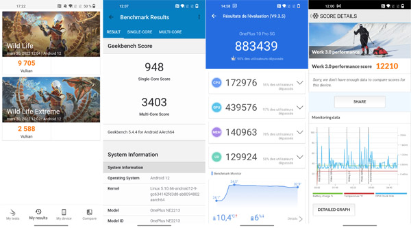 Avec son processeur Qualcomm Snapdragon 8 Gen 1, le OnePlus 10 Pro embarque la puce la plus véloce du moment pour un appareil sous Android et vient donc concurrencer les Oppo Find X5 Pro, Xiaomi 12 Pro, realme GT 2 Pro, le Motorola edge 30 Pro ou le Red Magic 7 qui disposent également de ce chipset mais vient aussi se mesurer au Samsung Galaxy S22 Plus proposé aux Etats-Unis alors que la version européenne embarque le processeur Exynos 2200. Le OnePlus 10 Pro est disponible avec 8 ou 12 Go de mémoire vive. Notez qu'il est possible d'ajouter jusqu?à 7 Go de mémoire vive virtuelle en puisant dans la mémoire de stockage. Pour y accéder, il faut se rendre dans le menu À propos de l'appareil. Avec une telle configuration, le smartphone propose d'excellentes performances et ne montre aucun signe de ralentissement lorsqu'on l'utilise au quotidien. Il répond toujours présent quelle que soit le nombre d'applications lancées et permet de proposer une fluidité extrêmement agréable. Les performances sont également au rendez-vous pour les jeux vidéo. OnePlus propose le moteur de jeu HyperBoost qui permet d'activer certaines fonctionnalités dédiées comme le stabilisateur d'image GPA qui vise à limiter les fluctuations de la fréquence de trame en mode jeu et minimise les baisses de fréquences. En outre, la fonction O-Sync permet d'optimiser la vitesse de synchronisation entre le processeur et l?écran afin de réduire le temps de réponse jusqu?à 30 millisecondes pour un temps de réactivité minimale. Les joueurs les plus exigeants devraient apprécier.