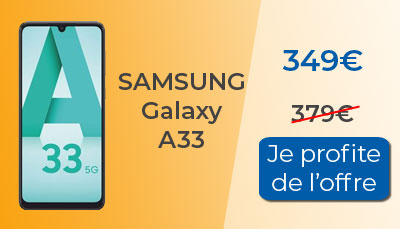 Tout comme le Galaxy A53 5G, le Samsung Galaxy A33 5G profite des semaines Galaxy Series pour être en promotion. Une offre de remboursement de 30? est proposée sur ce modèle jusqu'au 21 juin ainsi qu'une coque offerte, jusqu'au 29 mai prochain. Ainsi au final, au lieu de payer votre Galaxy A33 379?, il vous coutera seulement 349?. Samsung propose également de reprendre votre ancien téléphone. N?hésitez pas à le faire estimer pour connaître le montant de cette reprise.
