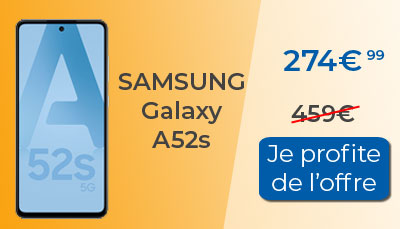 Le bon plan du jour, avant même le lancement des soldes d?été 2022, est signé Rakuten. Nous avons trouvé la meilleure offre pour acheter le très performant Samsung Galaxy A52s au meilleur prix. Avec une réduction incroyable de -40%, son prix chute de façon drastique. Vous pouvez ainsi acheter le Galaxy A52s au petit prix de 274.99? au lieu de 459?. Faites ainsi une économie immédiate de 184.01?. C'est assez exceptionnel pour ne pas passer à côté de cette belle offre.