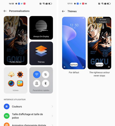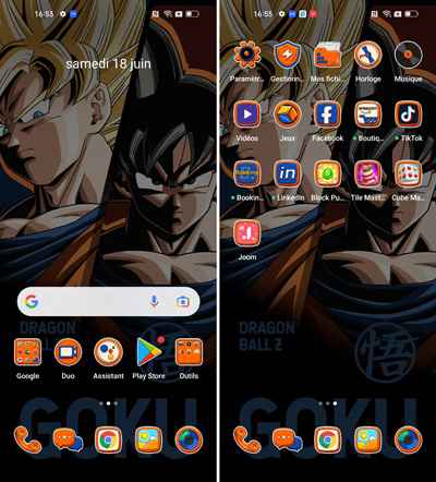 Lorsqu'on allume le smartphone, après sa configuration initiale, on est tout de suite dans l'ambiance du dessin animé. En effet, par défaut, il y a un fond d?écran installé représentant Son Goku et on peut aussi remarquer que les icônes sont redessinées aux couleurs et aux formes du dessin animé. Lorsqu'on installe une nouvelle application, son icône se met automatiquement aux couleurs du thème. Les dossiers créés lors de la réunion d'au moins deux raccourcis ont un fond orange. En plus de celui qui est appliqué par défaut, deux autres fonds d?écran sont proposés dans les paramètres du smartphone. Notez qu'il est possible d'appliquer un thème plus classique, le cas échéant.