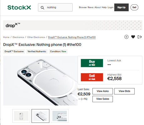 Pour son second produit, après les écouteurs transparents Nothing ear (1), la marque compte bien reproduire ce qu'elle a organisé lors du lancement. En effet, en 2021, Nothing avait collaboré avec la plateforme StockX.com afin de mettre aux enchères les 100 premiers exemplaires des Nothing ear (1) où la première paire gravée s'est vendue dix fois le prix normal demandé pour les écouteurs. Il s'agit donc de reproduire le même schéma pour le Nothing phone (1) dont le design a été dévoilé récemment à la faveur de quelques photos sur les réseaux sociaux et d'une présentation en Suisse. Une nouvelle fois, c'est la plateforme StockX.com qui propose aux enchères les 100 premiers exemplaires numérotés du phone (1). L'opération débute le 21 juin 2022 pour se terminer le 23 juin à 14h59. L'ensemble des bénéfices de cette vente sera reversé à un fond entièrement géré par la communauté Nothing.