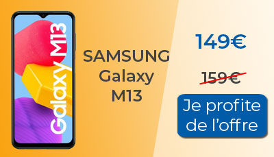 Encore moins cher, le Samsung Galaxy M13 est lui aussi en soldes. Avec une remise immédiate de 10?, vous pouvez dès maintenant l'acheter pour le petit prix de 149?. C'est le moment de se faire plaisir avec un nouveau téléphone, sans se ruiner !