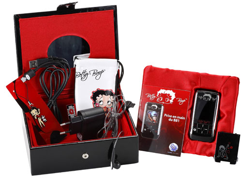 Avec son format slider plutôt compact et son égérie glamour, le téléphone Betty Boop est un mobile d'entrée de gamme vendu dans un superbe coffret décoré de strass, véritable boîte à bijoux dotée d'un miroir. Il est en plus livré avec deux cadeaux inédits à l'image de Betty : un bijou de portable et un étui.Ce téléphone n'intègre pas les dernières technologies comme le Bluetooth, le WiFi ou la 3G, mais contient les fonctions basiques telles qu'un appareil photo VGA, un lecteur MP3, la radio FM, 2 Mo de mémoire ainsi qu'un lecteur de cartes micro SD.
